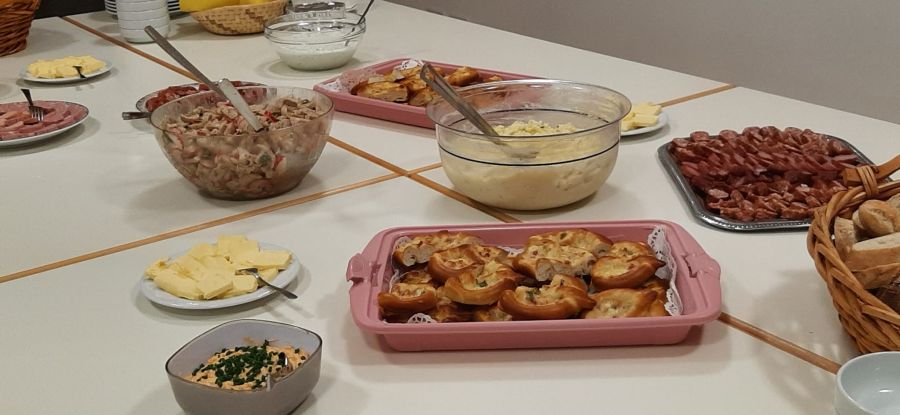 Anschließend traf man sich im Pfarrheim zum Erntedank-Hutzaabend, zu dem Rita Gleißner 30 Frauen, Herrn Pfarrer Pirner und sogar 2 Männer begrüßen konnte. Luise Köllner und Petra Irlbacher hatten die lange Tafel herbstlich geschmückt. Rita Gleißner sorgte für die musikalische Unterhaltung mit der Steirischen Harmonika. Zu Beginn trug das Vorstandsteam besinnliche Gedanken zum Erntedank und zum Thema Dankbarkeit vor. Pfarrer Pirner sprach ein Segensgebet und lud zum Tischgebet ein, bevor sich alle am herbstlichen Buffet stärken konnten. Es gab Kartoffeln mit Kräuterquark, Obazdn, Erdäpfelkas, deftige Wurst, Weißwurstsalat, Flammkuchenbrezen und Bauernbrot. Diese Speisen hatten die Mitglieder des Führungskreises zubereitet. Die Brotzeit schmeckte wunderbar und alle verbrachten einen unterhaltsamen Abend in gemütlicher Runde.