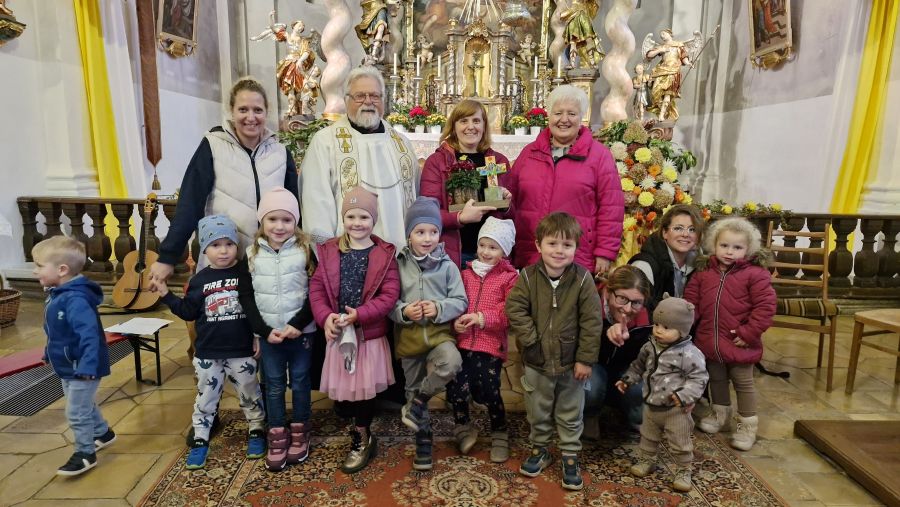 Luhe. Seit 2010 gibt es in Luhe die „Kinderkirche“. Etwa alle zwei Monate sind Eltern mit Kleinkindern von 1 bis 6 Jahren zu einem Kleinkindergottesdienst in die Pfarrkirche St. Martin eingeladen, der vom Kinderkirchen-Team gestaltet wird. Das jeweilige Thema wird dabei kindgerecht aufbereitet und anschaulich für die Kleinsten dargestellt. Als fester Rahmen wird jedes Mal zu Beginn das Lied „Dass Gott sich daran freut“ und am Ende „Pass auf, kleines Auge“ gesungen. Das können die Kleinkinder bereits auswendig und singen und klatschen dabei begeistert mit. Ebenso wird das Vater Unser jedes Mal gemeinsam gesungen und mit dem ganzen Körper gebetet. Die übrige Gestaltung hängt vom jahreszeitlichen Thema ab. So fanden sich am vergangenen Dienstag wieder viele Eltern mit ihren Kindern in der Pfarrkirche ein und nahmen im Stuhlkreis im Altarraum Platz, um miteinander das Erntedankfest zu feiern und Gott für die Gaben der Schöpfung zu danken. Die Kinder hatten von zu Hause Obst, Gemüse oder Blumen aus dem Garten mitgebracht, zogen damit in einer Prozession singend durch die Kirche und durften sie dann am Erntealtar ablegen. Pfarrer Arnold Pirner betrachtete mit den Kleinen all die Erntegaben, die in diesem Jahr wieder in Feldern und Gärten gewachsen waren. Anhand eines Zwetschgenkerns, den jedes Kind in der Hand halten und befühlen durfte, wurde den Kleinen das Wunder verdeutlicht, wie aus einem kleinen Kern ein großer Baum wachsen kann, der später einmal wohlschmeckende Früchte trägt. Die Kinder spielten dann das Pflanzen, Wachsen, Reifen und Fruchtbringen pantomimisch nach. Passend dazu wurde das Lied „Alles hat mal angefangen, manchmal unscheinbar und klein“ gesungen. Bei einem Tanz zu dem Lied „Ist das Getreide reif“ durften die Kinder auch das Teilen miteinander üben. Eltern sprachen Dankrufe, zu denen die Kinder Blumen in eine Vase in der gestalteten Mitte stellen durften. Nach dem Vater Unser und dem Segen wurde Gisela Schulze aus dem Kinderkirchen-Team verabschiedet, dem sie seit 2014 angehört hatte. Rita Gleißner dankte ihr für die sehr engagierte Mitarbeit in den vergangenen 11 Jahren und übergab ihr ein Blumenpräsent zum Dank. Pfarrer Arnold Pirner schloss sich den Dankesworten an, überreichte Gisela Schulze ein Kreuz zum Andenken an ihre lange Zeit im Kinderkirchen-Team und wünschte ihr für die Zukunft alles Gute und Gottes Segen. Sandra Thaler, Kathi Spiegl und Annika Birner vom Team schlossen sich den Wünschen an. Zum Abschluss gab es leckeren Zwetschgenkuchen, den Gisela Schulze für alle gebacken hatte.