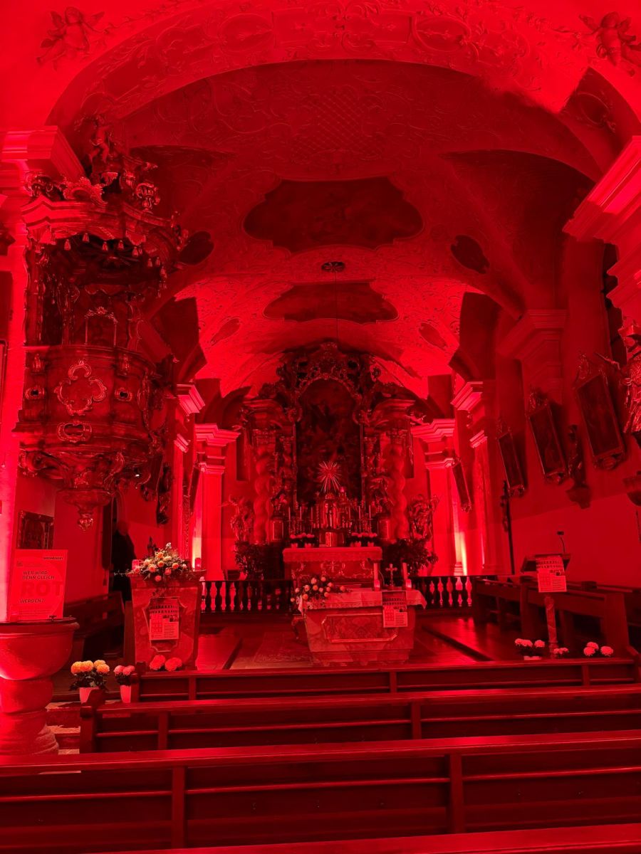 Das Ziel des Pilgerweges war schließlich die Pfarrkirche St. Martin, die aus Anlass des „Red Wednesday“, außen und innen in der Farbe Rot beleuchtet war und einen überwältigenden Eindruck bot. Die technischen Voraussetzungen dafür hatte Georg Hirsch mit Scheinwerfern und Farbfolien geschaffen, unterstützt von Willi Köllner und Timo Kreuzer. „Red Wednesday“ ist eine Aktion von „Kirche in Not“, die im Jahr 2015 ins Leben gerufen wurde, um auf die Situation verfolgter Christen in aller Welt aufmerksam zu machen. Seitdem werden alljährlich an diesem Tag berühmte Bauwerke und Kathedralen auf der ganzen Welt in Rot beleuchtet, zum Beispiel das Colosseum und der TreviBrunnen in Rom, die Christusstatue in Rio de Janeiro, die Kirche Sacre Coeur in Paris sowie auch einige Kathedralen in Deutschland. Die Pfarrei Luhe beteiligte sich zum zweiten Mal an dieser weltumspannenden Aktion. Die Farbe Rot ist das Symbol für das Blut, das viele Christen wegen ihres Glaubens vergossen haben. Aktuell wird die freie Religionsausübung in rund 62 Staaten einschränkt oder brutal verhindert.