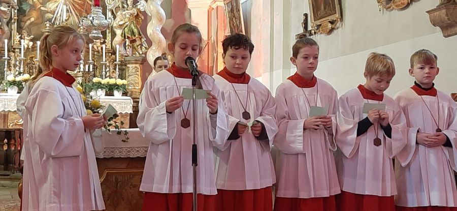 Pfarrer Pirner überreichte ihnen die gesegneten Plaketten, die sie beim Dienst am Altar tragen.